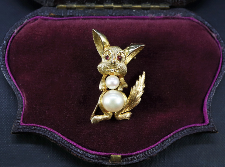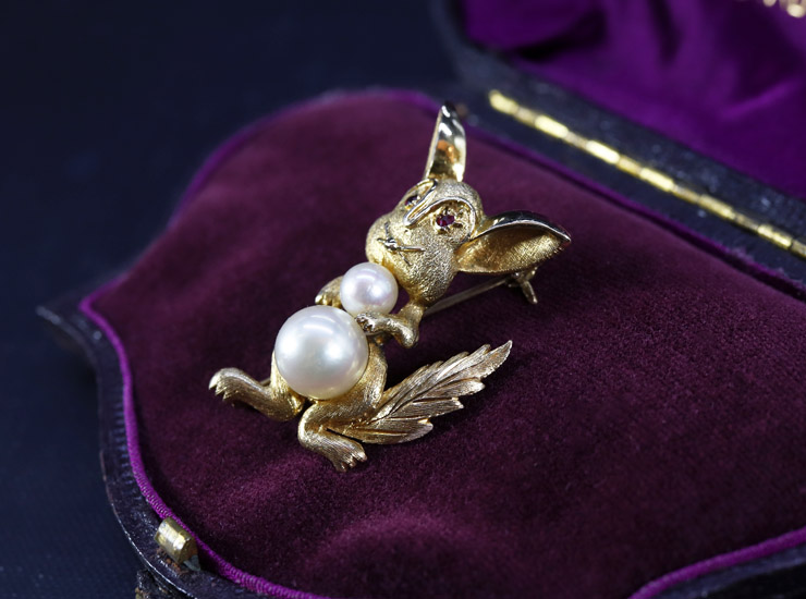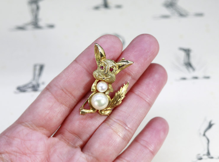 1968年のヴィンテージブローチです。おちゃめな顔のリスがモチーフ。体には艶やかなパール(養殖真珠)が2つ、ぱっちりお目々には赤色の石があしらわれています。価格を抑えるため、こちらは宝石鑑別(ソーティング)を行っていませんが、おそらく天然のルビーだと思われます。
