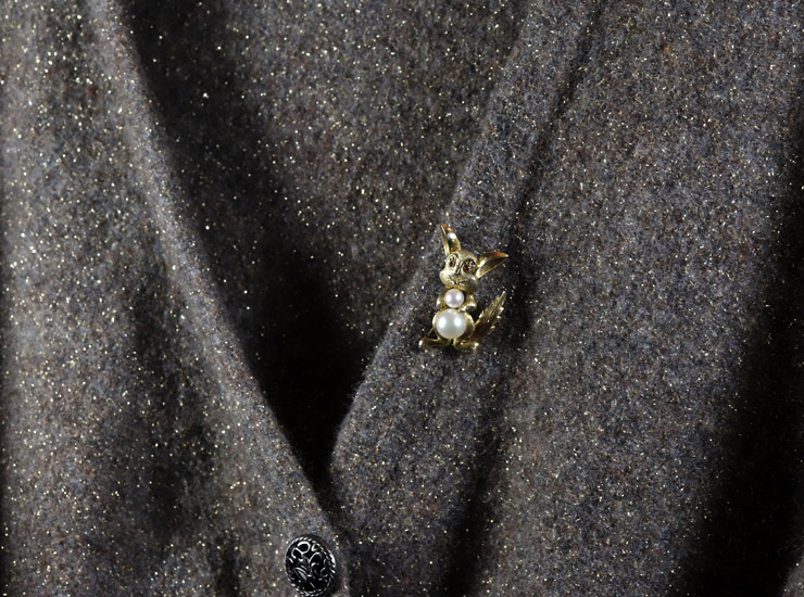 地金は9金。明るい華やかなイエローゴールドです。ブローチは半立体ですが、重量は5.4グラムとゴールドがたっぷり使用されたボリュームのある作りです。サイズは縦35ミリ×横22ミリ。パール大は約8ミリ、パール小は約5ミリ。存在感のあるサイズで、暗い色ばかりになりがちな季節の胸元を楽しく彩ってくれます。パールが使用されているので、可愛らしいだけではなく、品の良い華やかさも加わります。