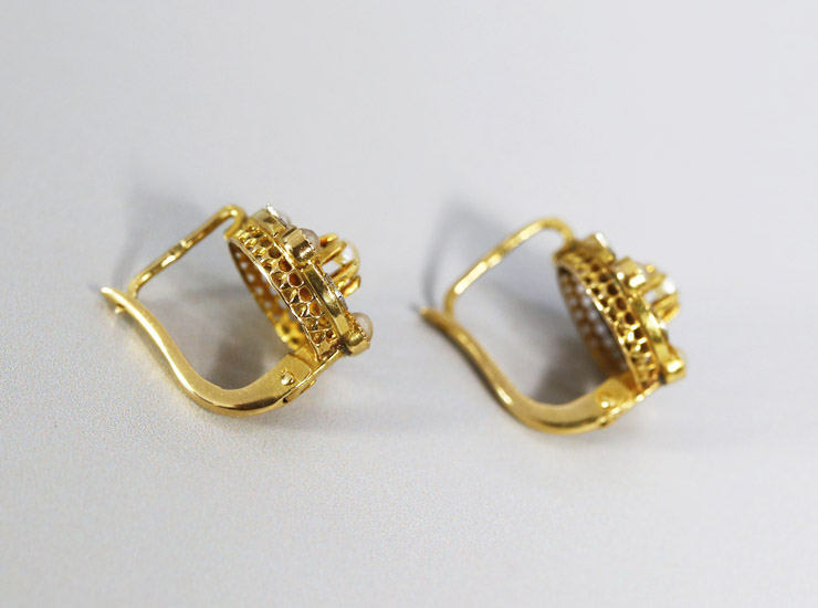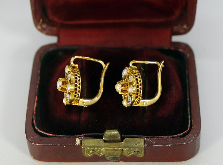 ピアスに18金を示すフランスのホールマーク(鷲の頭)、メーカーマーク入り。アンティーク18金パールダイヤモンドピアスは良い状態です。