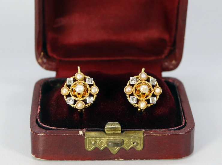 1910年頃のフランス製アンティークピアスです。天然の真珠を半分にカットしたハーフパールが使用されています。養殖真珠がない時代は真珠は大変稀少だったため、半分にカットして使用されることが多く、ハーフパールはアンティークならではの素材と言えます。パールと小さなローズカットダイヤモンドが交互に配置された四角と丸のセッティングに留められた凝ったデザイン。中央のパールは、少しでこぼこしていますが、天然らしい美しい照りがあり、決まりすぎない粒感が可愛らしく温かみが感じられます。