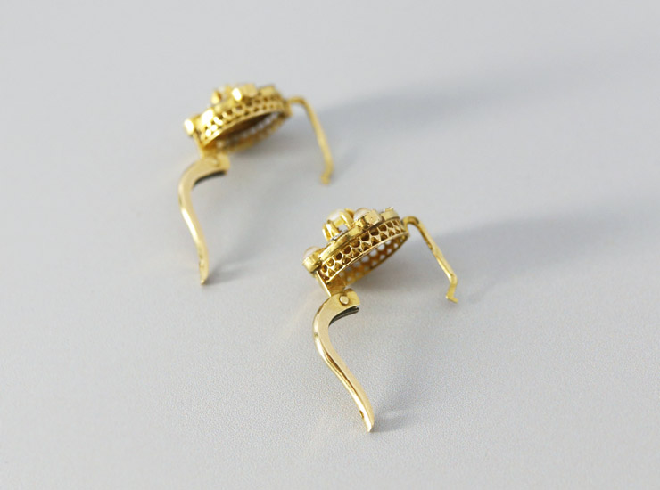 地金は18金。ダイヤモンドセッティングのみプラチナ。リッチな色合いのゴールドが華やかです。留め具が上下に開閉するレバーバックピアスで、モチーフが耳たぶにぴたりと寄り添うような着用感。裏まで細やかな作りで、どの角度から見ても美しいピアスです。モチーフの大きさは直径11ミリ。中央のパールは約2.5ミリ。