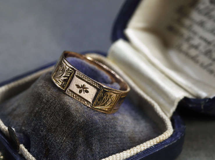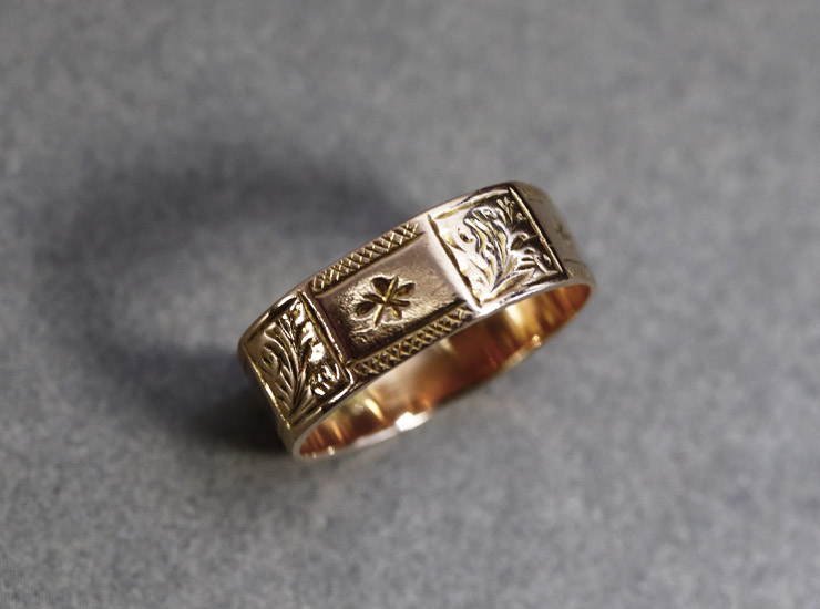 地金はややピンクを帯びた12金。リングのサイズは約8.5号。幅は6ミリ。145年という長い歳月を経て今なお美しい稀少なアンティーク結婚指輪です。
