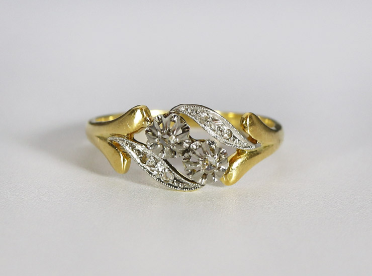 1910年頃のフランス製アンティークリングです。ダイヤモンドが2石並んだToi et Moi(トワ・エ・モア)「あなたと私」と呼ばれるデザイン。仲睦まじいカップルを宝石に見立てたロマンティックなリングです。ダイヤモンドはローズカットで約1.7ミリ。小さなつぼみのような慎ましくも美しい輝きで、指を動かすたびにキラキラと光がこぼれ落ちます。上下の斜めラインにもダイヤモンドが2石ずつセットされています。