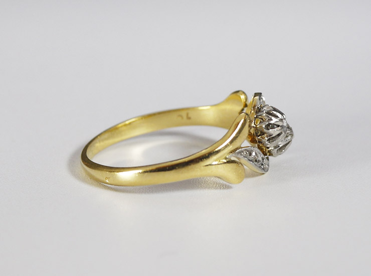 地金はダイヤモンドと爪とセッティング表面はプラチナで、リング全体は18金イエローゴールドです。サイズは、14.5号よりは大きくて、15号よりはわずかに小さいです。派手な主張はせず上品な佇まいで、繊細な華やかさを添えてくれます。普段着にもさらりと身につけられる美しいアンティークリングです。