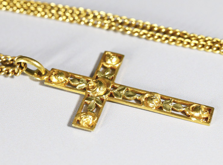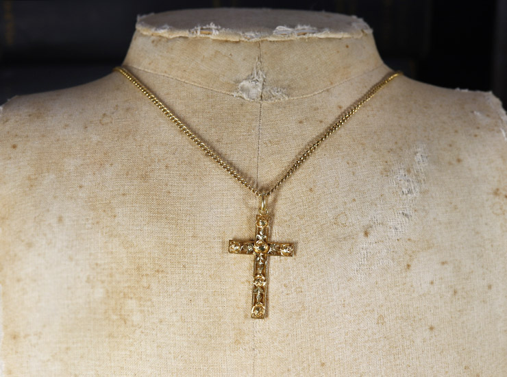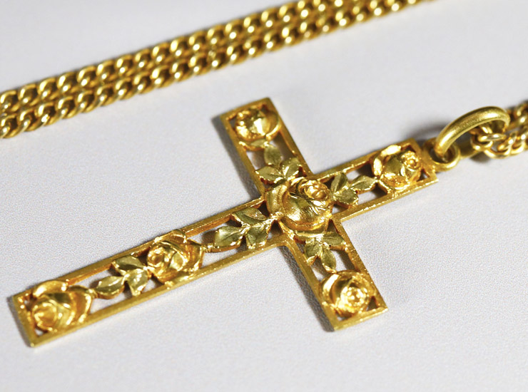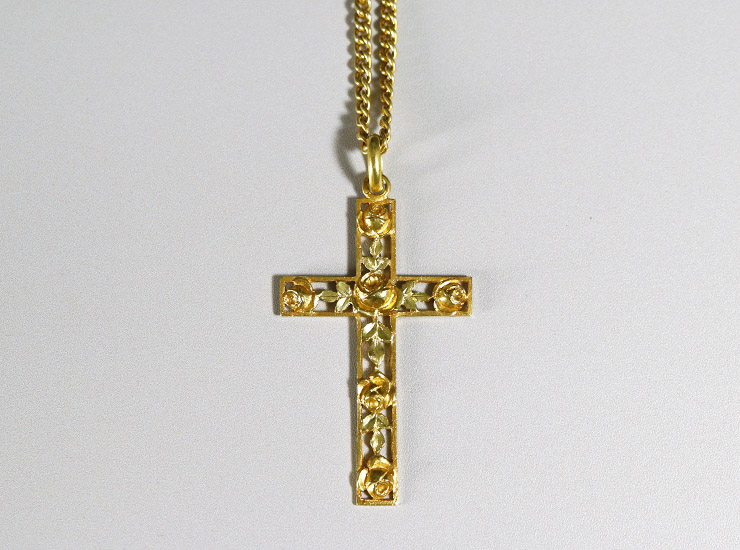 このような時間と手間をかけて作られた丁寧な細工の作品は、アンティークの方がお求め安い価格で見つかることがあります。細やかな薔薇のレリーフはやわらかで生命が吹き込まれたよう。優しさと強さが共存した、特別な存在感を放つクロスペンダントです。