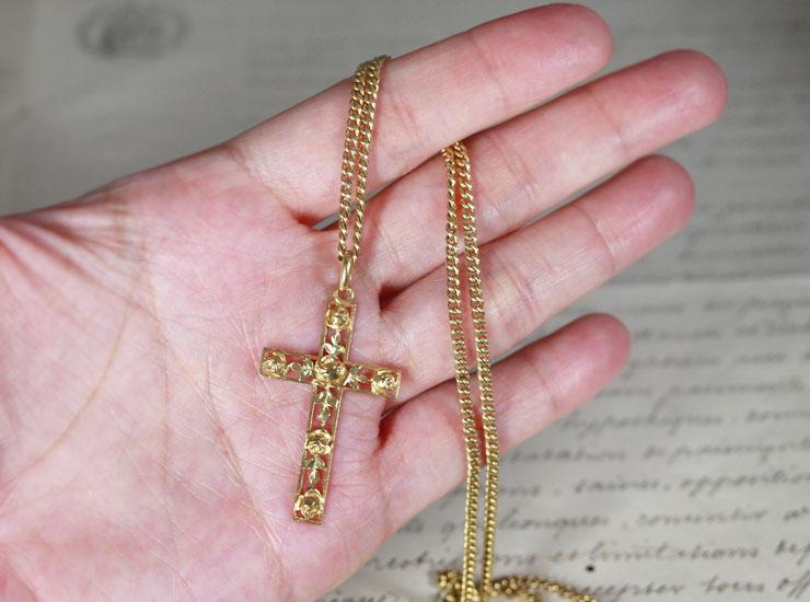 地金は18金。フランス製アンティークらしいピンクを帯びた濃厚な色合いのゴールド。葉の色は、ほのかにグリーンを帯びています。クロスは全体的にセミマットで光沢感が抑えられつつ、ゴールドの上品な艶を保っています。クロスの大きさは縦36ミリ×横22ミリ。バチカンを含めた全長は43ミリ。やや大きめのサイズで作りもしっかりしていますが、透かしが効いた重くなりすぎない印象です。