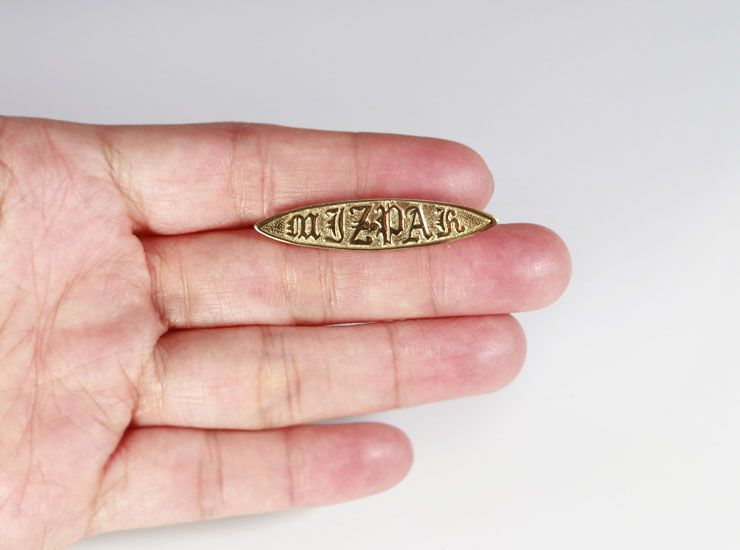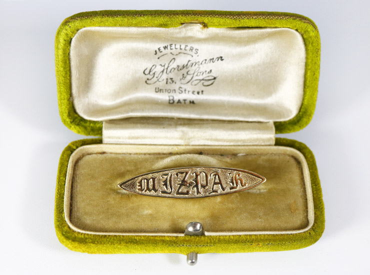 1979年のイギリス製ヴィンテージブローチです。MIZPAHの文字が浮き出たデザイン。MIZPAHとは、旧約聖書創世記の一節に登場する言葉で、ヘブライ語で「見張り塔」という意味です。元々は約束を守る「見張り塔」という意味でしたが、「離れていても、主があなたとわたしを見守りますように。」という言葉から、MIZPAHは離れている者同士の絆のシンボルとなりました。大切な人と離れ離れになる時に無事に戻ってきますように、という願いを込めてMIZPAHの文字が刻まれたジュエリーが贈られるようになりました。