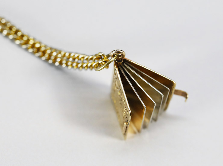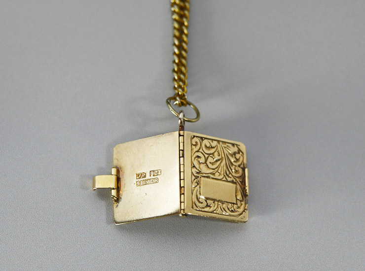 1960年頃のイギリス製。小さな本のチャームです。実際にページをめくることができる本物の本をミニチュアにした作りで、表には美しい唐草模様の手彫りが施されています。本自体は9金で作られており、中の4枚のページはシルバー(銀製)です。本はサイドの留め具でしっかり閉まりますので、ご使用時に本が開いてしまうことはありません。
