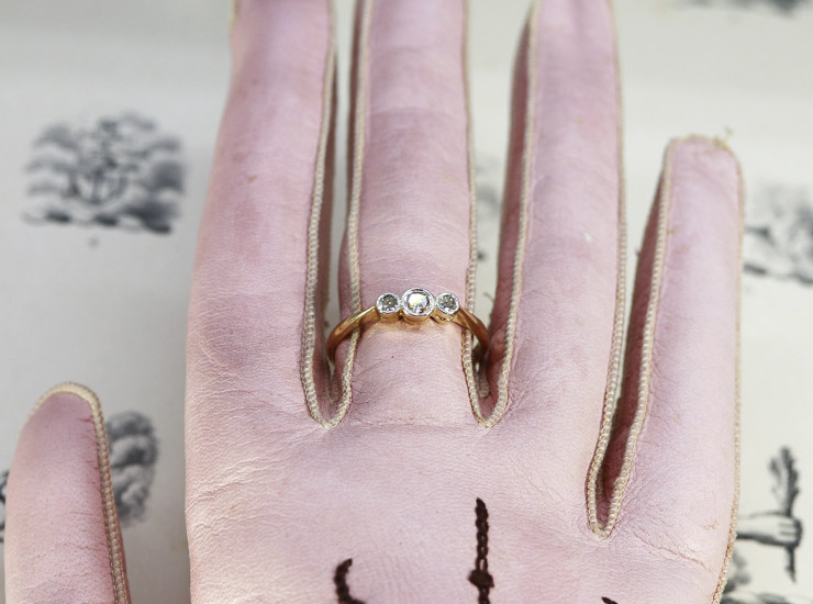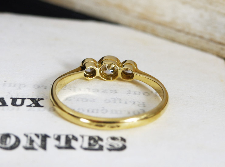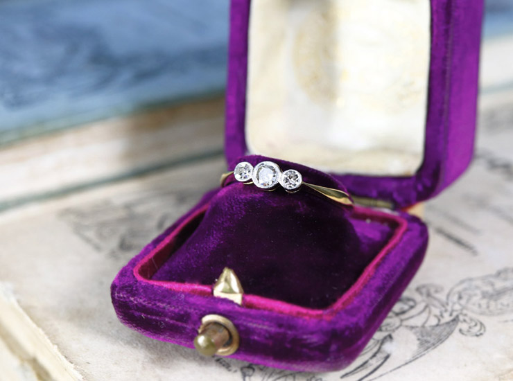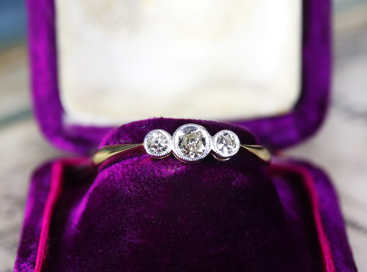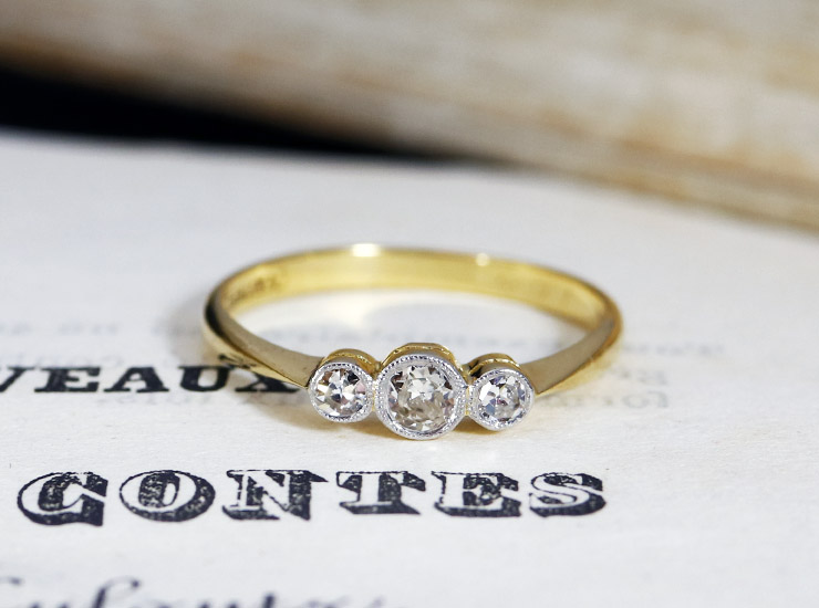 1920年頃のイギリス製アンティークダイヤモンドリングです。透明度の高い煌びやかなダイヤモンドが3石並んだデザイン。ダイヤモンドの大きさは中央約3ミリ、両端約2ミリと決して大きくありませんが、それぞれ溢れんばかりに輝いて存在感をアピール。細部まで丁寧に仕上げられ、小さくても上質な作りと確かな存在感が魅力です。