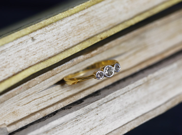 地金はダイヤモンド周り表面のミル打ちが施された部分のみプラチナで、リング全体は18金イエローゴールド。活躍の幅が広く、お手持ちのジュエリーとのコーディネートもお楽しみいただけます。普段使いにぴったりのアンティークダイヤモンドリングです。