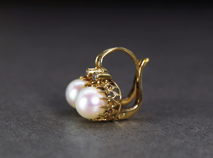 1920年頃のフランス製アンティークピアスです。照りの美しいパールが小さな爪にそっと包まれるようにセットされ、ゴールドの色味がパールの白さを際立たせています。パール上部の小さなダイヤモンドは、ゴツゴツとした原石のような荒削りのローズカットで、パールの柔らかな質感を引き立て、輝きを添えています。使用されているのは当時の古い養殖真珠ですが、約100年という時を経た今な輝くような美しい艶を保っています。