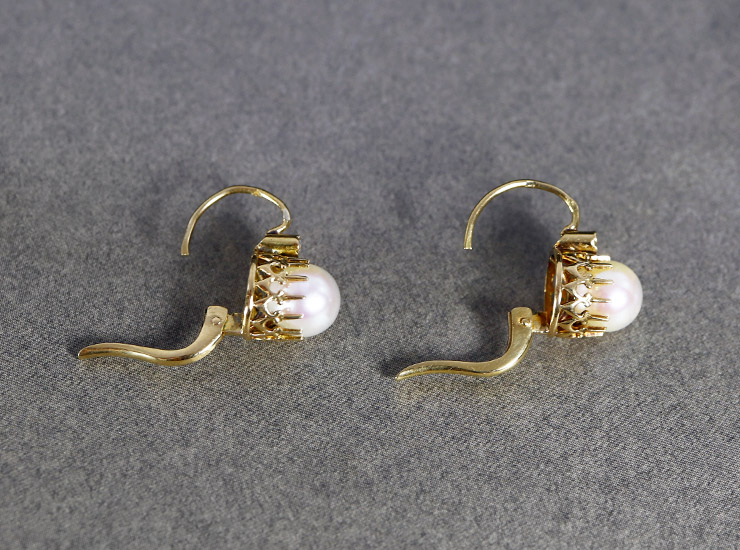 ピアスにフランスの18金のホールマーク入り。アンティーク18金パールダイヤモンドピアスは良い状態です。