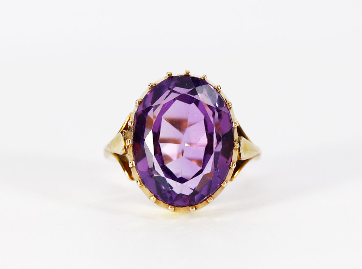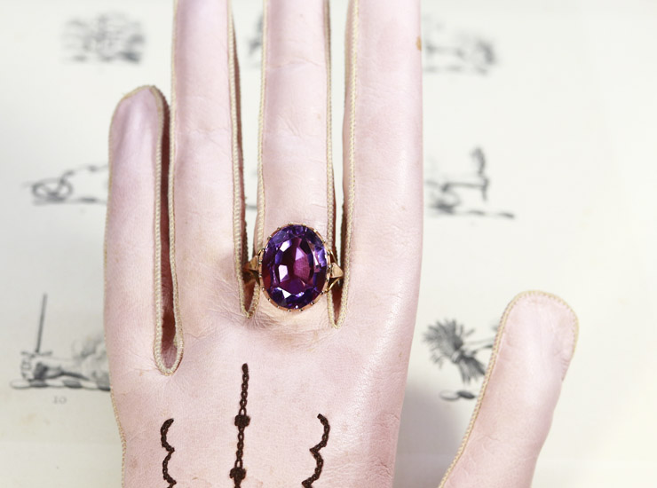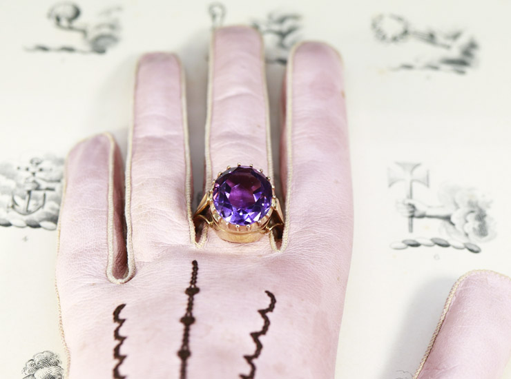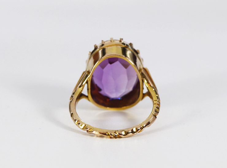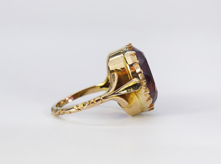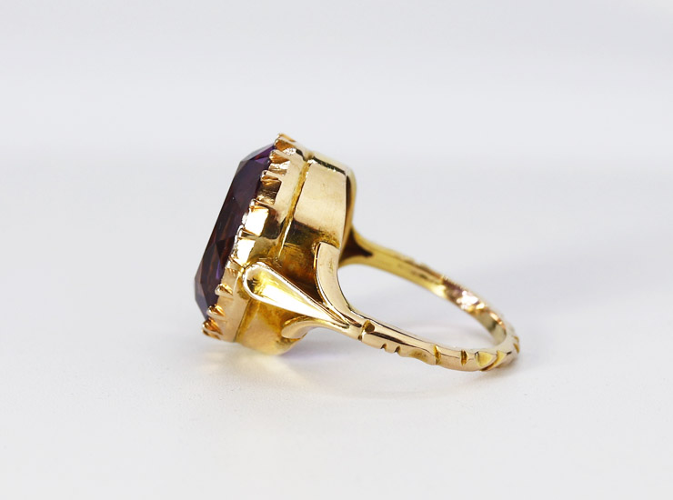 リングの刻印が薄れて見えなくなっていますが、ゴールドテスターにて9金と確認済み。アンティーク9金大粒アメシストリングは良い状態です。