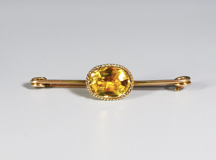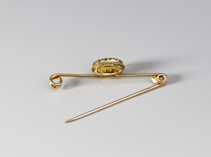 1900年頃のイギリス製。美しい黄昏色のシトリンのアンティークブローチです。ピンブローチの真ん中にオーバルシェイプのシトリンがセットされています。ピン部分は無駄を省いた究極にシンプルなデザインですが、シトリンを飾る枠は凝っており、小さな爪の間にはギザギザの装飾、さらに細いロープ状にねじった金線が周囲を飾り、優美さがプラスされています。