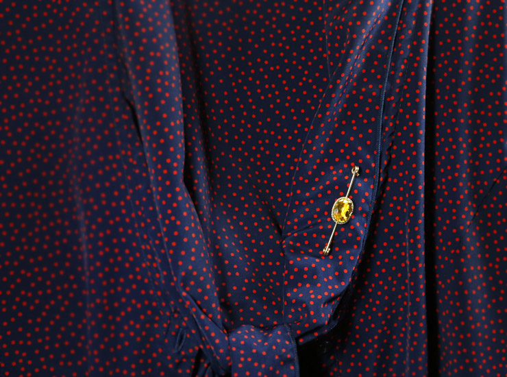 地金は9金イエローゴールド。ブローチの全長は52ミリ、シトリンは縦11ミリ×横15ミリ(枠含む)。重量感がありますので、厚手の服向けで、横向きにも縦向きにもお好みでご使用いただけます。暗い色の服になりがちな季節に、美しいシトリンの美しい彩りを。