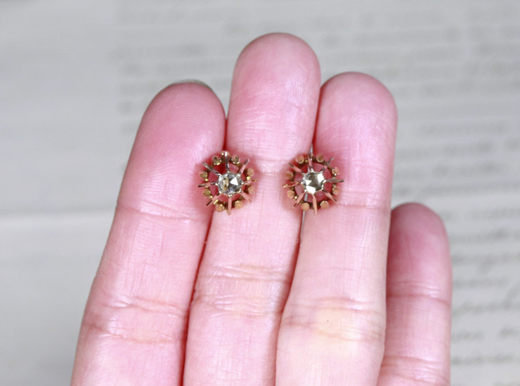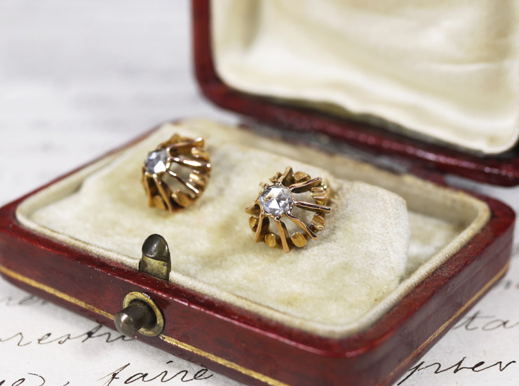 1880年頃のフランス製アンティークローズカットダイヤモンドピアスです。元はドルムーズタイプだったピアスを熟練の職人さんにスタッドピアスにお仕立て直しをしてもらい新たに生まれ変わりました。金具が壊れていたのですが、幸いモチーフ部分はダメージがなく美しい状態だったので、モチーフに合うよう少し太めの18金ポストに交換してもらいました。キャッチはしっかり固定する18金シリコンキャッチです。
