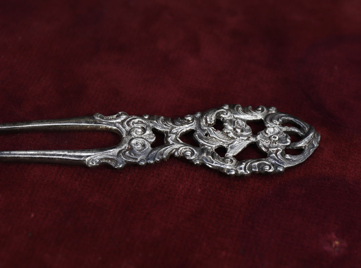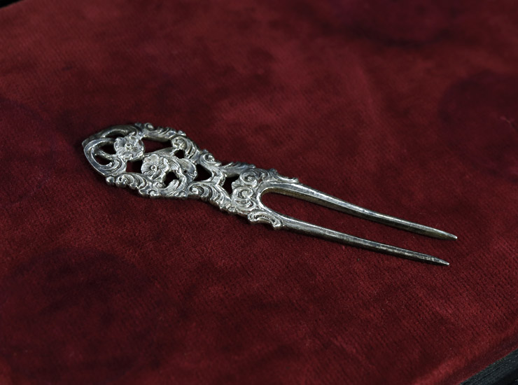 1900年頃のアンティーク銀製ヘアコーム(髪飾り)です。優雅なアールヌーヴォーデザイン。かんざしのように髪に挿して使用します。ヴィンテージスタイルのウェディングや華やかな装いはもちろん、和装にも似合いそうです。全長9.5センチ(髪に挿す部分は4.9センチ、装飾部分4.6センチ)。小ぶりですが、シルバーに厚みがある重量感のある丈夫な作りで、単なる飾りではなく実用性があります。