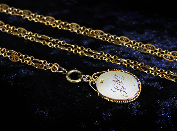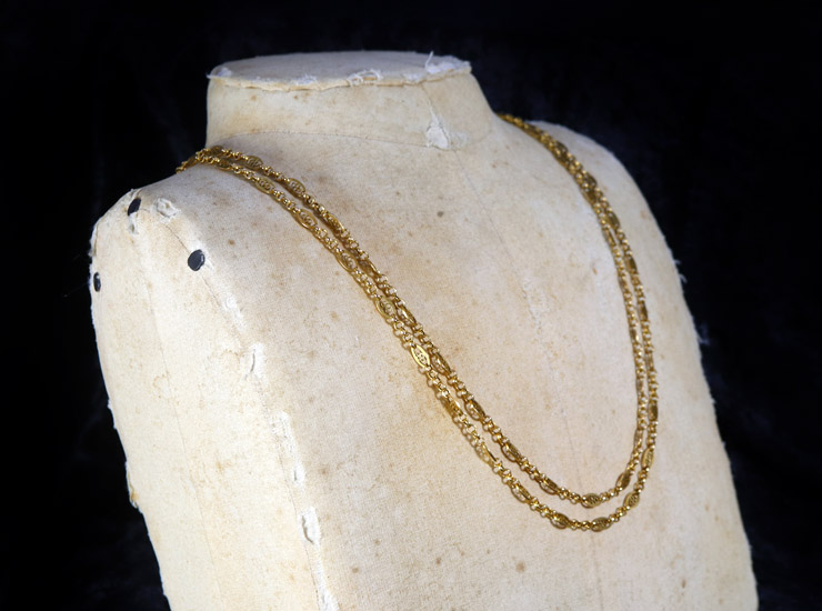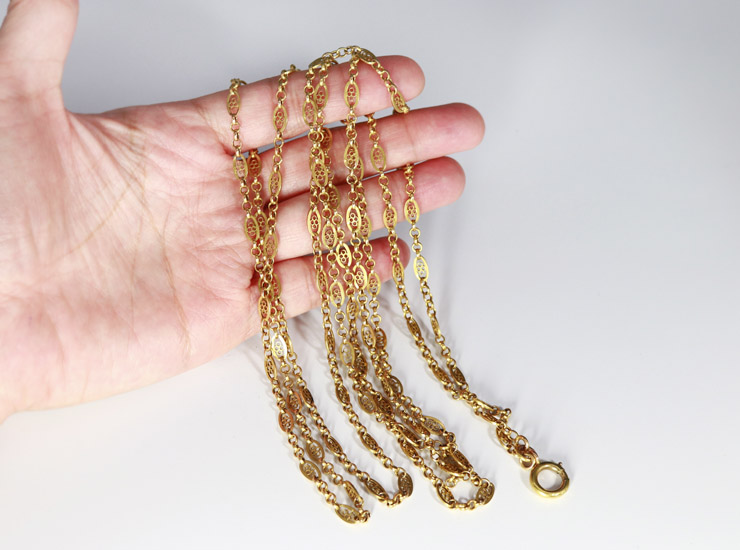1890年頃のフランス製。現在では入手が非常に難しいアンティークゴールドロングチェーンです。当時は懐中時計などを下げるために使われていたチェーンです。あまりにも素晴らしい細工のチェーンで手放しがたく、長いこと在庫として保管していました。ロングチェーンは海外でも人気が高く、金の価格が高騰した現在では、ますます手が届かない存在になっています。