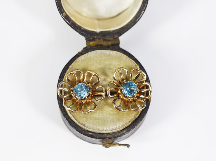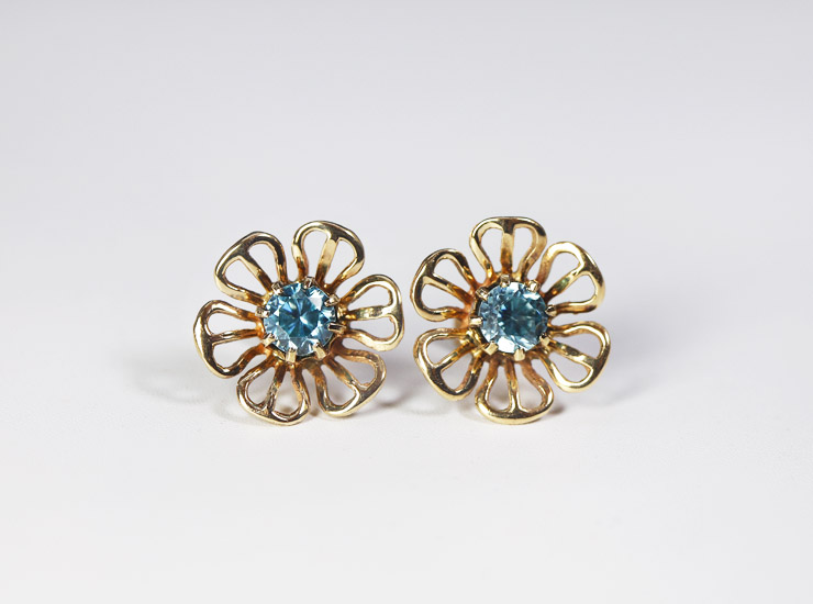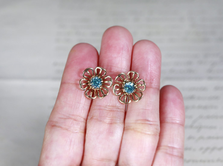 1963年のイギリス製ヴィンテージピアスです。花の真ん中に明るい蛍光ブルーのジルコンが一石。ジルコンはその名前から、人口石のキュービックジルコニアと間違われてしまうことがありますが、正真正銘天然の宝石です。花モチーフのヴィンテージピアスは、ありそうで意外と少なく、あったとしても小さすぎて大人の女性には物足りないことが多いのですが、こちらのピアスは程よく大きく、ボリュームがあります。花の直径は14ミリで、ジルコンは約4.8ミリ。