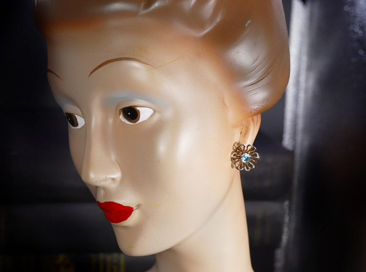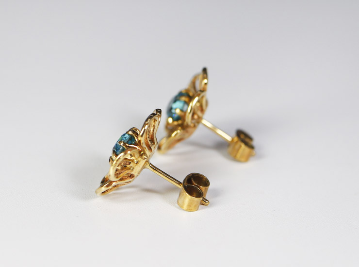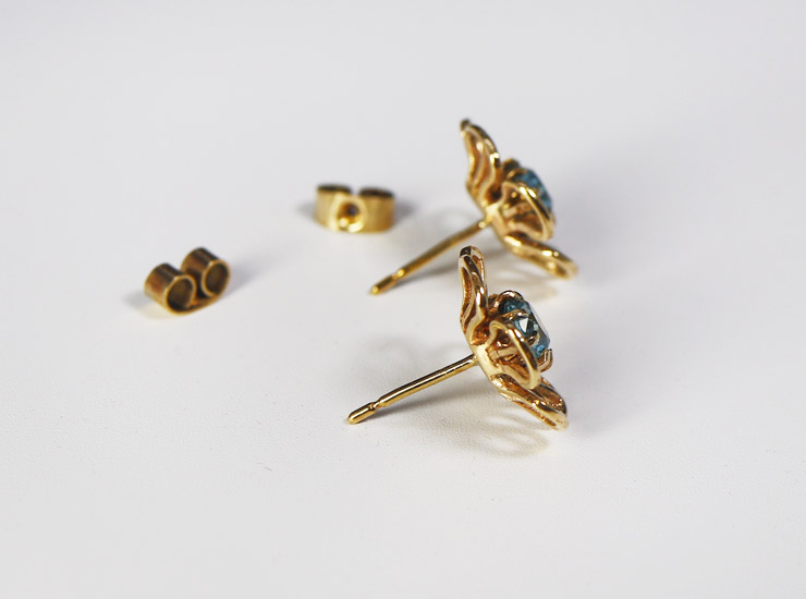 地金は9金。ピンクを帯びたゴールドです。ピアスはスタッドタイプで、ポスト(耳にさす棒部分)は、一般的は日本製の18金よりもわずかに太めでしっかりとした作りです。目の覚めるような鮮やかなジルコンのピアスは、身につけるだけでお顔周りがパッと華やかになります。気分まで明るくなるような、可愛らしくも美しいヴィンテージピアスです。