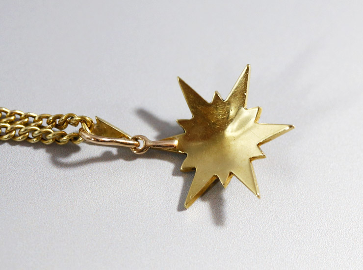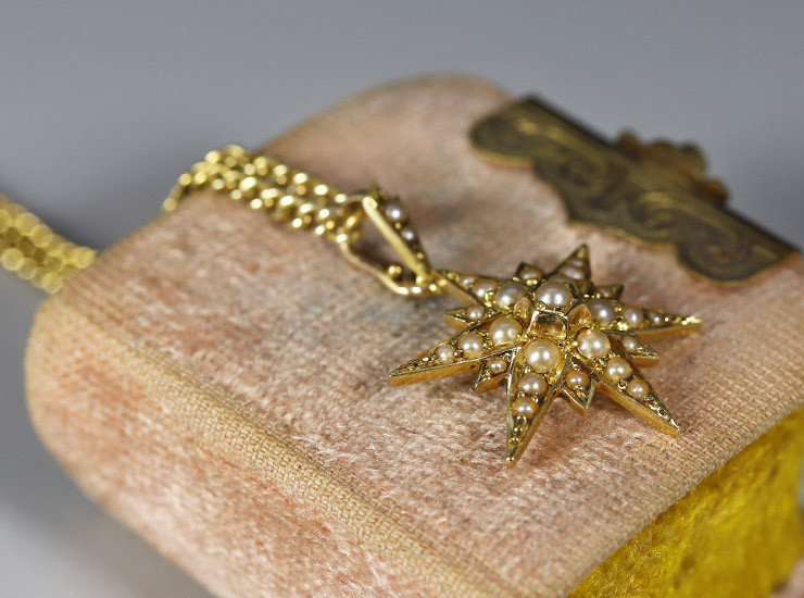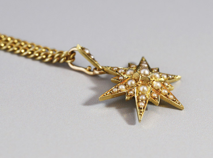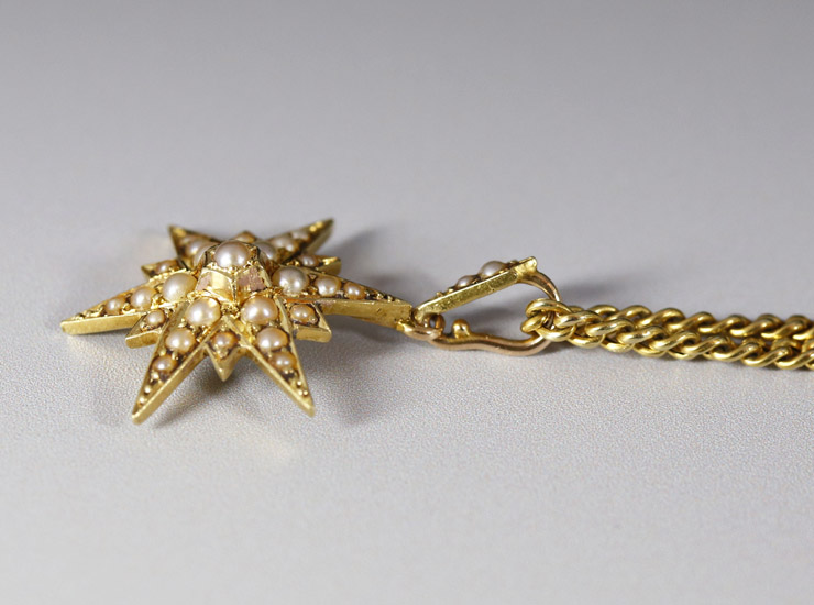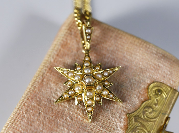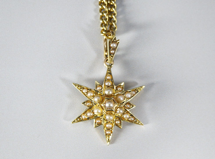 ペンダントに刻印はありませんが、ゴールドテスターにて15金と確認済み。アンティーク15金シードパール星ペンダントは良い状態です。※チェーンは商品には含まれません。