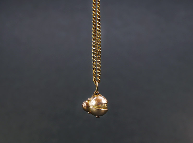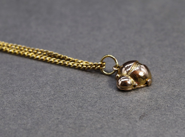 地金は9金。丸カンが小さなチャームですが、程良く厚みがありしっかりした作りです。後ろにある開いた部分から爪を差し込むと簡単に開けることができます。閉める時はカチリと音を立てしっかり閉まります。微笑ましく可愛らしいテントウムシ親子のゴールドチャームです。