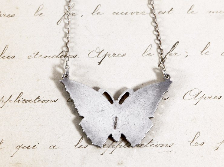 バタフライの大きさは縦25ミリ×横38ミリ。羽の両端からチェーンが繋がった作りで、バタフライを含むネックレスの全長は40センチ。エナメルに目立った傷もなく、大変美しい状態です。ペンダント裏には、シルバー、1978年を示すイギリスのホールマーク(刻印)とメーカーマークもくっきりと残っています。