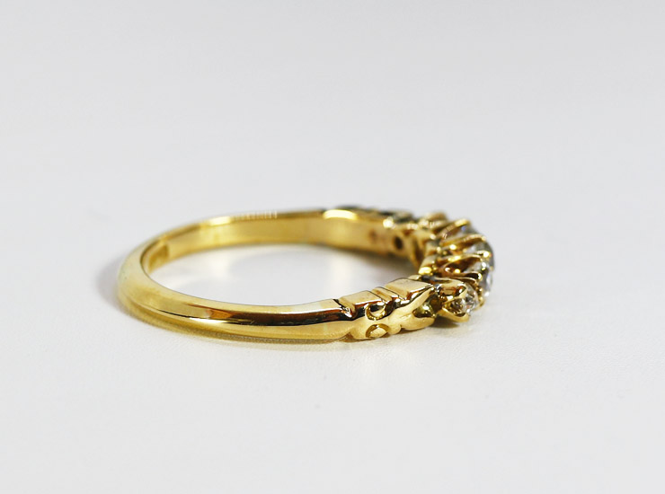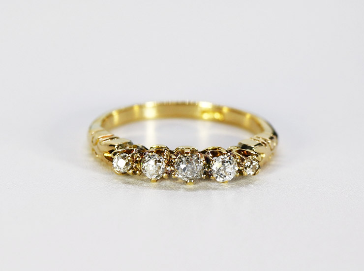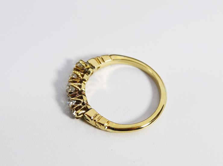 リングに「18ct」と18金の刻印入り。アンティーク18金ダイヤモンド5石リングは良い状態です。