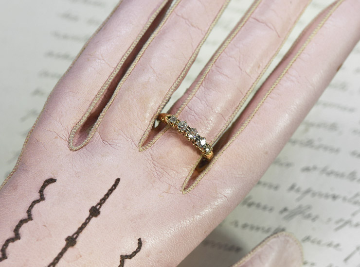1900年頃のイギリス製アンティークリングです。透明感たっぷりのダイヤモンド5石が爪で留められたクラシカルなデザイン。ダイヤモンドはすべてオールドヨーロピアンカットで、ころんと厚みがあります。センターの3石はほぼ同じ大きさで約2.5ミリ、両端の2石は少し小さく約2ミリ。爪を含む台座の高さは4ミリ。ダイヤモンドに厚みがあるため、表面的な煌めきだけではなく、底から光が湧いてくるような奥行きのある輝きを見せてくれます。