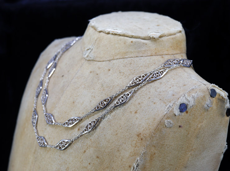 1900年頃のフランス製アンティークネックレスです。レースのような繊細な細工が目を引く美しいシルバー(銀製)フィリグリーネックレスです。ゴールドのフィリグリーネックレスは入手が非常に困難な上、価格も高騰しているため、いつもの装いに取り入れるのが難しいという方でも、シルバーのフィリグリーネックレスなら取り入れやすいと思います。