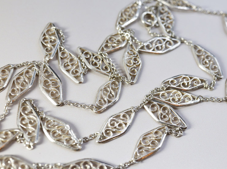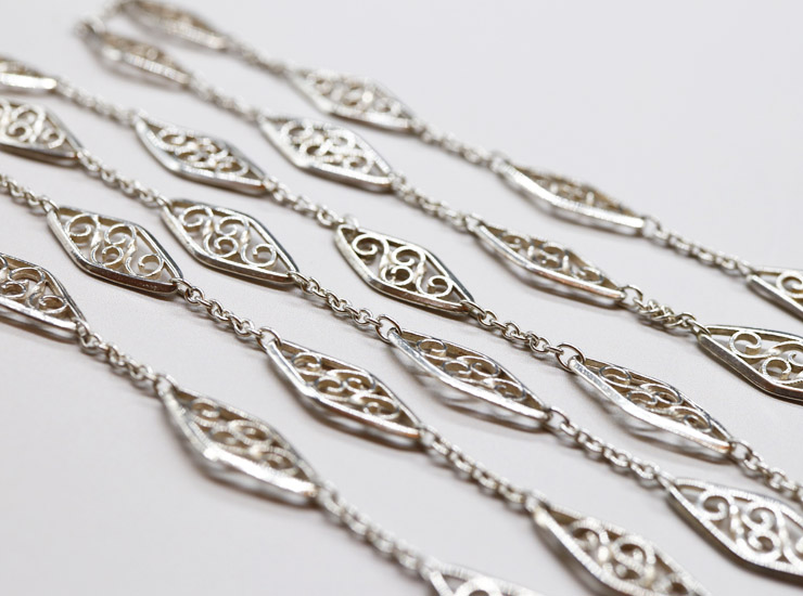 菱形のフィリグリーパーツの大きさは縦ミリ×横ミリ。長さは89.5センチで、一連でも二連でもつけていただけます。また、手首にぐるぐる巻いてブレスレットとしてご使用することもできます。重量は16.8グラム。しっかりとした作りですが重すぎず、暑い季節にもさらと身につけていただけます。ひとつあれば、おしゃれの幅がぐっと広がります。