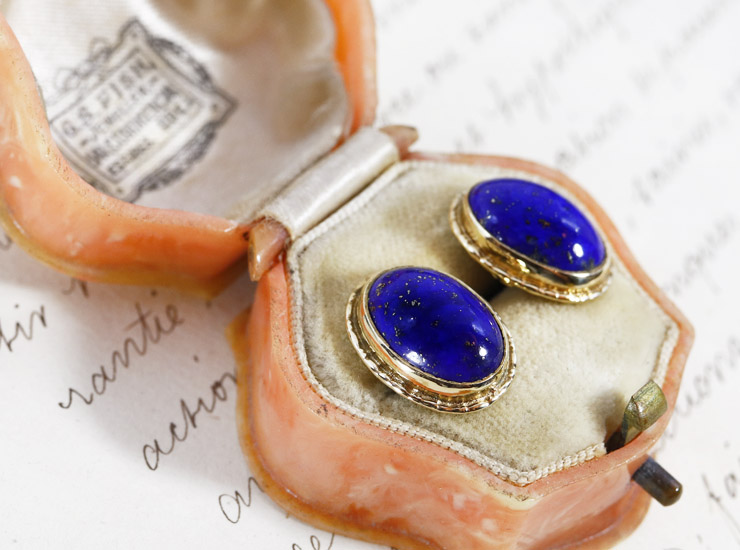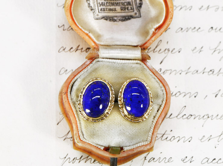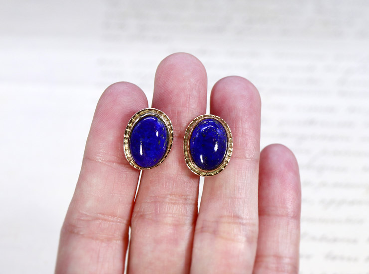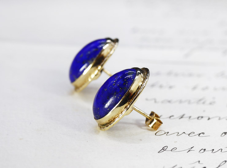1994年のイギリス製ラピスラズリピアスです。30年前のピアスですので、ヴィンテージと呼ぶほどは古くはありませんが、深海のような深い青色に惹かれ入手しました。ラピスラズリ特有の細かな斑点が、深海に届く微かな光に静かに揺れる気泡のよう。縦14ミリ×横10ミリの大きなラピスラズリなので、その神秘的なラピスラズリの美しさを存分にお楽しみいただけます。