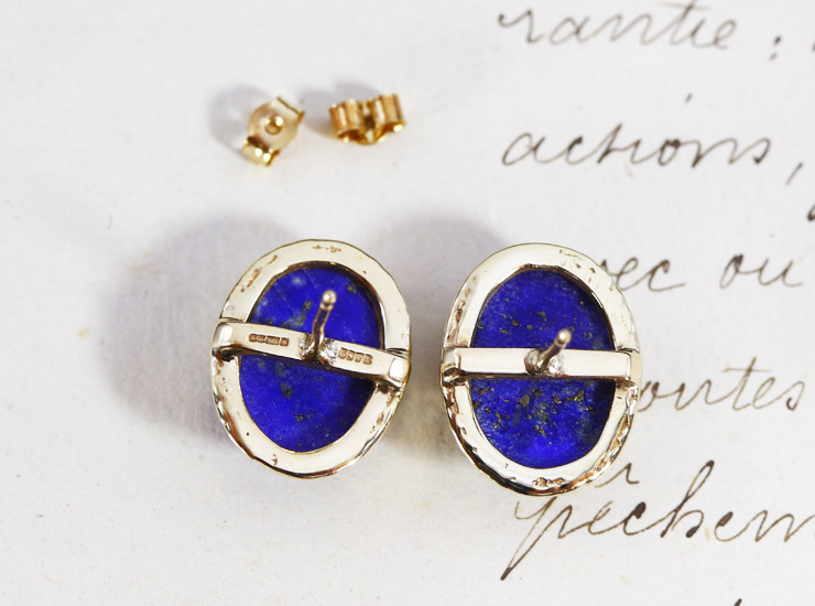 片方のピアスに9金、1994年を示すイギリスのホールマーク(刻印)、メーカーマーク入り。9金大粒ラピスラズリピアスは良い状態です。