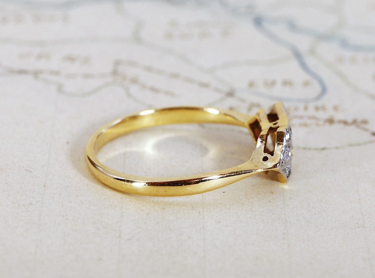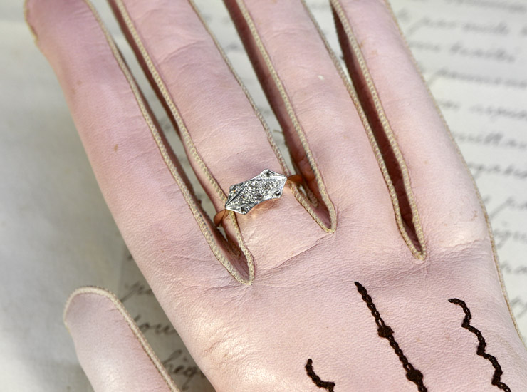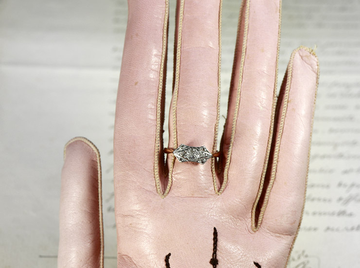 地金はダイヤモンドセッティング表面のみプラチナで、リング全体は18金イエロ−ゴールド。フェイスの大きさは縦6ミリ×横13ミリ。フェイスのユニークなフォルムがより目立つように、リングのショルダーは正面から見ると細く、側面から見ると厚みのあるナイフエッジ技法が用いられています。さりげなく見えますが、美しく見せるために、細部にまでこだわった作りのリングです。アールデコらしい凜とした佇まいのリングを日常に取り入れてみてください。