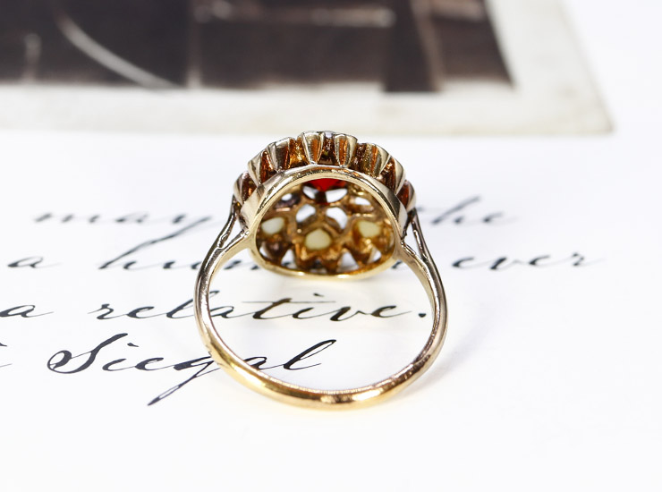 1960年頃のイギリス製。深い赤色のロードライトガーネットをパールがぐるりと囲んだヴィンテージリングです。よく見るとパールのセッティングはハートの形をしていて、キュンとする乙女なデザインです。丸いフェイスと、横から見てもパールの高い爪や、一段高く持ち上げられたガーネットでコロンとした印象ですが、アームがほっそりとしているので実際に身につけると意外なほどすっきりとして見えます。
