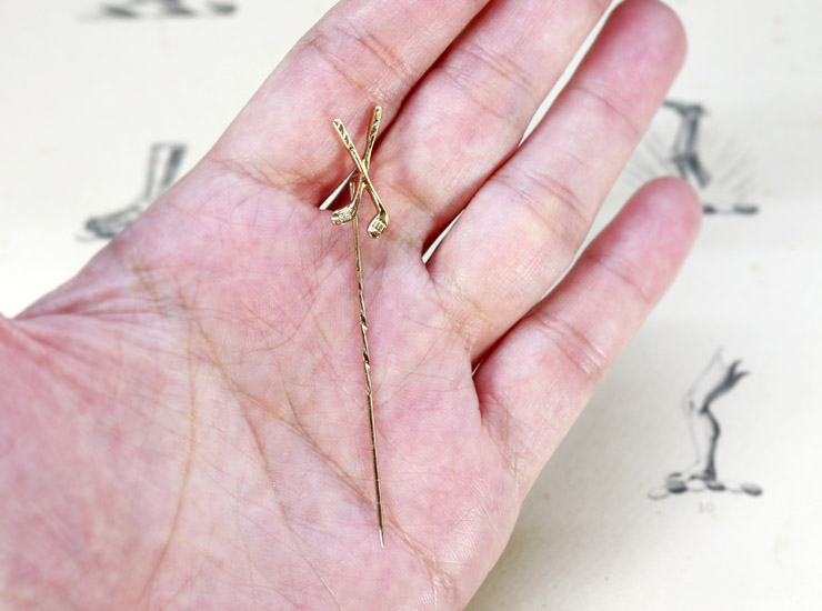 地金は9金イエローゴールド。モチーフの大きさは縦19ミリ×横9ミリ。ピンの長さは54ミリ、モチーフを含むピンの全長は64ミリ。こちらの商品には、ピン先をカバーするキャッチを付けてお届けいたします。キャッチはゴールドではなく合金です。ゴルフ好きの方に。