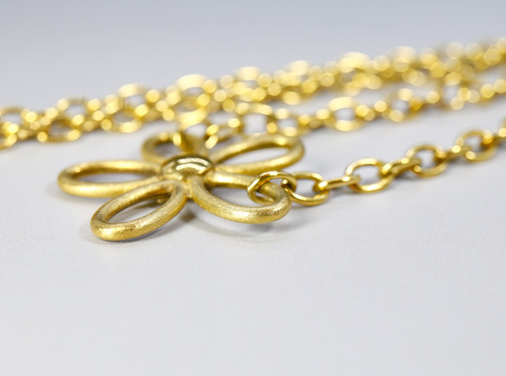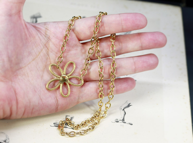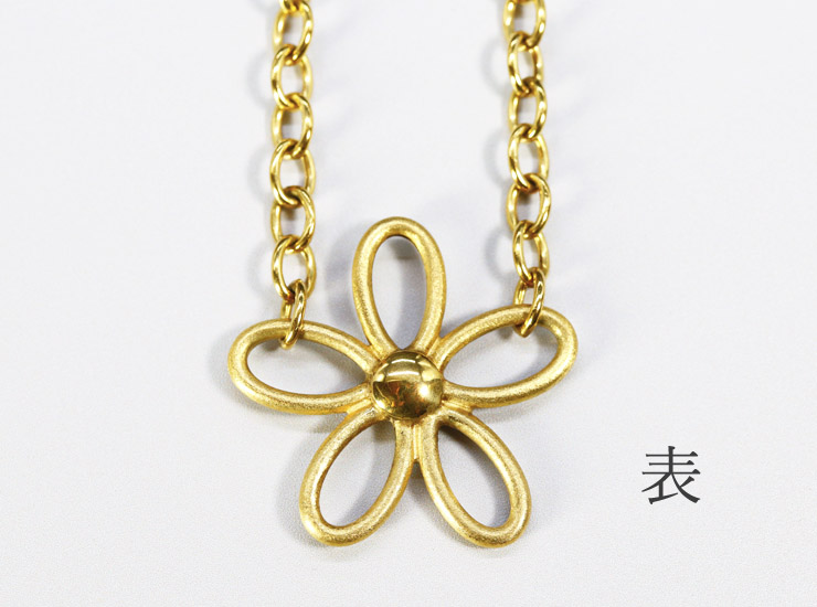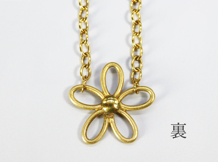 フラワーは中が空洞の作りで、実際に手に取ると大きさの割に軽量です。軽量といっても6.2グラムもありますので、実際に着用するとデコルテに綺麗に垂れ下がります。地金は、フラワーもネックレス部分もすべて9金です。コンベンションマークと呼ばれる1975年に施行された国際条約が結ばれた国(イギリス、スイス、スウェーデン等)が使用するゴールドの刻印が入っています。9金にしては色が濃く18金に近い色味です。