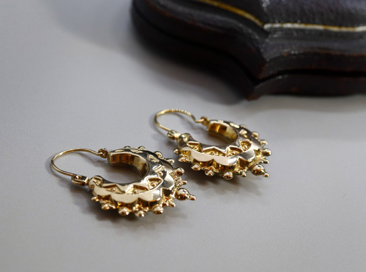 1965年のイギリス製ヴィンテージピアスです。凝った細工が目を引くジプシーイヤリング(ピアス)と呼ばれるデザイン。立体的で程良くボリュームがありますが、中が空洞の作りのため、見た目よりも軽量になっています。
