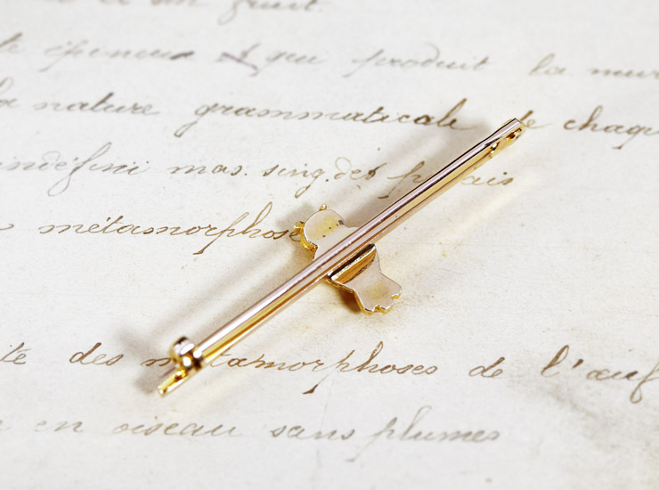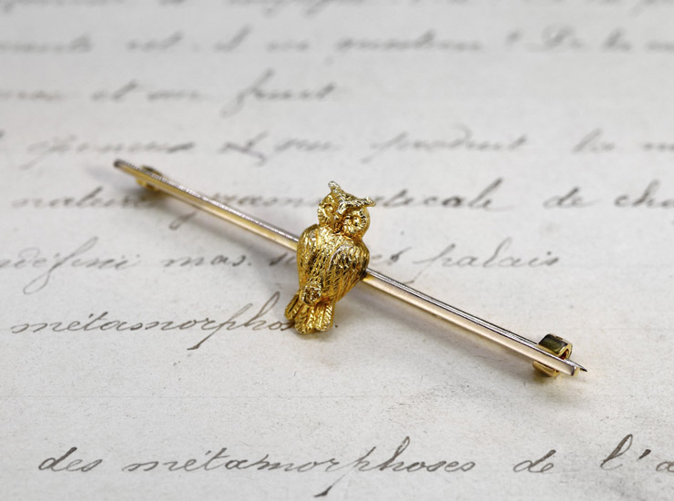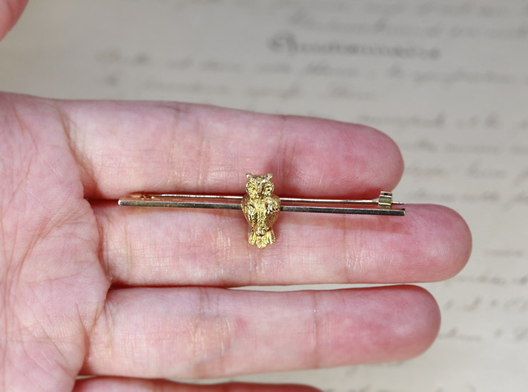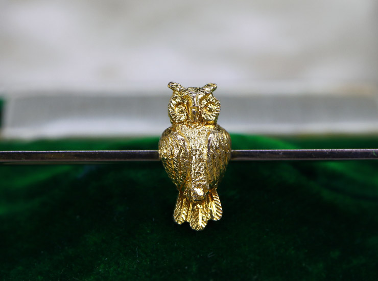 地金は9金。細いバーの真ん中に小さなフクロウが配置されたデザインで、バーもフクロウも立体感のある作りです。バーは中が空洞のようですが、フクロウは中は空洞ではないため、手にとるとずしりと重量感が感じられます。ピンは、回転式のロックになっていますので使用中に落ちにくく、安心してご使用いただけます。