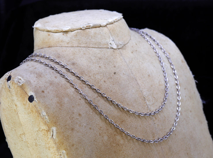 チェーンは銀製(シルバー)で、フランスの銀のホールマーク(猪の頭)が入っています。チェーンは長い1本ではなく輪の状態になっており、大きめの引き輪が付いています。二重にしても約70センチありますので、頭からすっぽりとかぶってご着用いただけます。また、引き輪でチェーンの長さを調節したり、二重にした状態でお手持ちのペンダントトップを付けたりと、アイデア次第で色々な使い方が楽しめます。