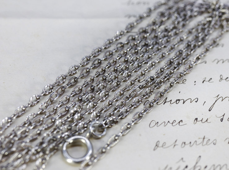 1900年頃のフランス製。シンプルながら美しい作りの上質なアンティークシルバーロングチェーンです。細身のチェーンは、異なる模様とテクスチャの加工が交互にが施されています。
