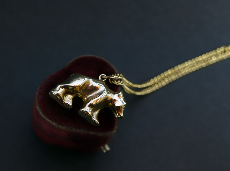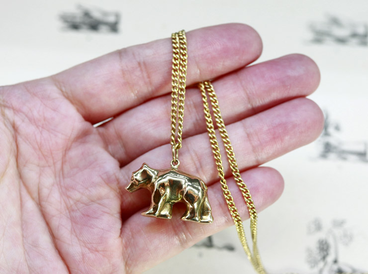 地金は9金。立体的な形状ですが、中が空洞の作りなので大きさの割に軽量です。少しへこみや傷がありますが、元々木彫りのようなゴツゴツとしたシルエットなので、まったく気になりません。ありそうでなかなか見つからないシロクマモチーフのゴールドジュエリーです。