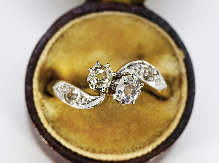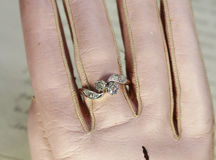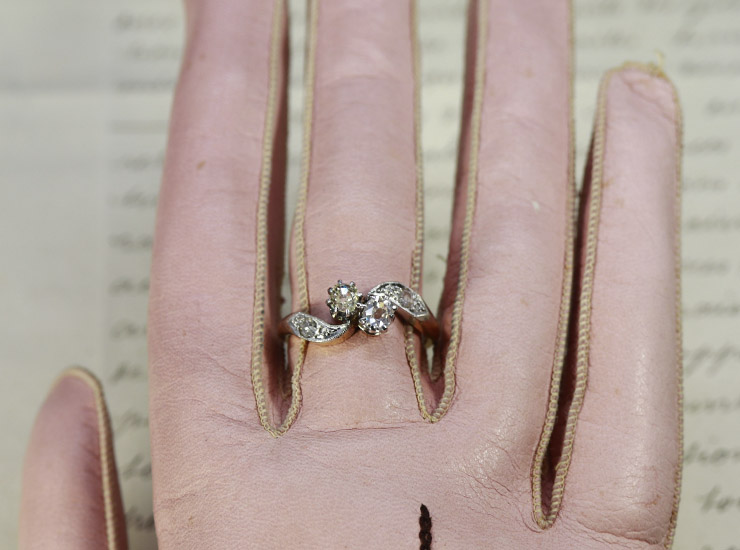 1910年頃のイギリス製アンティークリングです。クロスオーバーリングと呼ばれるカーブを描いたショルダーの中央にメインの宝石が並んだデザイン。中央の2石のダイヤモンドは大きさとカットが異なり、1石はオールドマインカットで大きさは約3ミリ、もう1石はやや縦長のオールドカットで大きさは縦4ミリ×横3.1ミリ。どちらも透明度が高く、大変美しい輝きを放ちます。また、ショルダーにも2石のダイヤモンドが配されています。どちらもオールドカットで大きさは約2ミリ。その脇石の1石に傷があります(掲載写真で矢印の箇所)。着用時には気にならない程度の傷で、そこから傷が広がっていくこともありません。目立つ傷ではありませんが、お値引きしております。実際にその美しさをご覧頂けたら、多少の傷など気にならないほど魅力的なリングです。