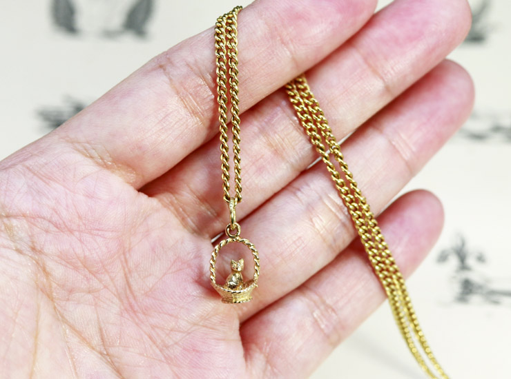 地金は9金。カゴの大きさは縦11ミリ×横9ミリ。とても小さなネコですが、シルエットで一目でネコと分かる可愛らしいヴィンテージチャームです。