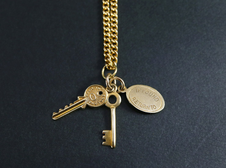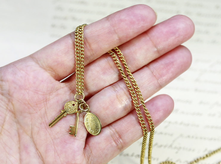 地金は9金。2本の鍵の大きさは約17ミリ、タグは12ミリ。軽量ですので、細いチェーンにも合わせていただけます。お手持ちのブレスレットやネックレスに合わせてご使用ください。
