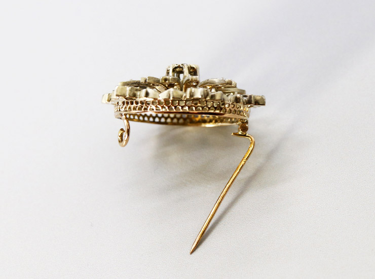 地金は、花びらは銀製(シルバー)で、ブローチの台座はピンクを帯びた18金。1838年から1919年までの短い期間に使用された、一部のゴールド製品にしか見られない希少なフランスの18金のホールマーク「馬の頭」が入っています。