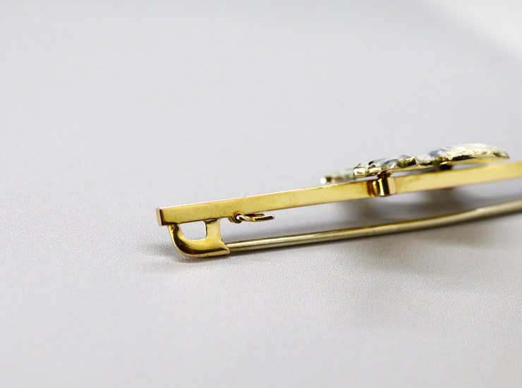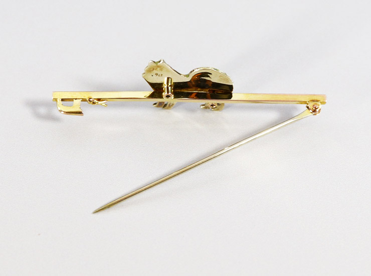 地金は犬もバーブローチもすべて9金イエローゴールド。9金ゴールドの上からエナメルが施されている作りです。しっかりと厚みのある作りで、重みがあります。犬の大きさは縦18ミリ×横18ミリ。ブローチの全長は54ミリ。ルーペで確認すると、エナメルに僅かな剥がれはありますが、肉眼ではまったく気にならない程度で全体的に良い状態です。