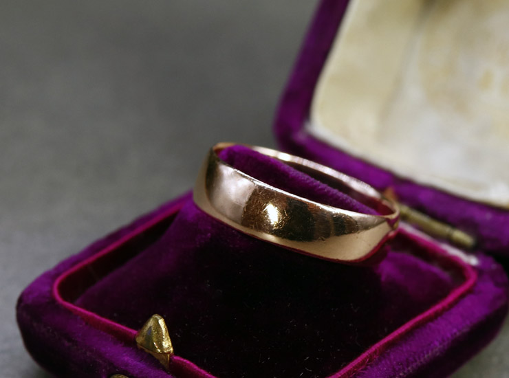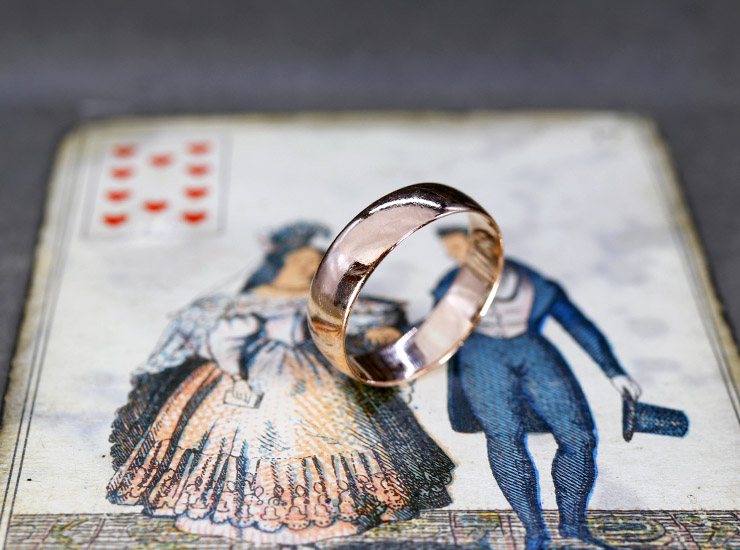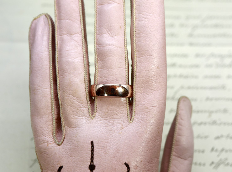 1904年のイギリス製。飾りや彫金のほどこされていないプレーンな少し幅広の結婚指輪です。指にすっと馴染む滑らかな着け心地で、アンティークならではのゴールドのしっとりとした艶が美しく温かみが感じられます。