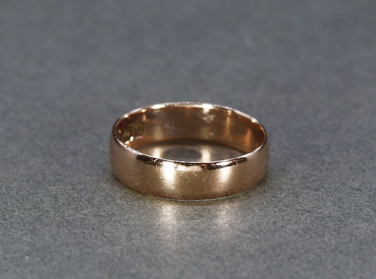 地金は9金。ほんのりピンクを帯びた深みのある綺麗な色合いのゴールド。幅は5ミリ。リング内側のホールマーク(刻印)もくっきり残っているのも魅力です。さらりと1点使いで楽しむのはもちろん、ミニマルでプレーンなデザインですので、お手持ちのジュエリーとのコーディネートにも活躍してくれます。