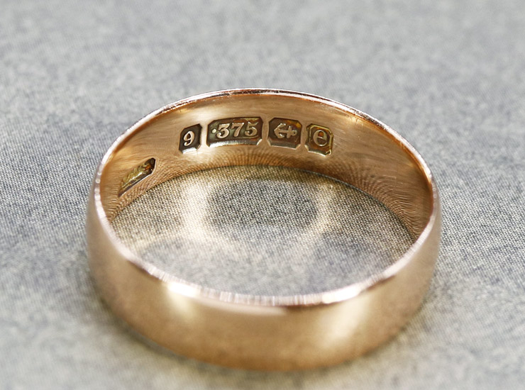 リングに9金、1904年を示すイギリスのホールマーク(刻印)、メーカーマーク入り。アンティーク9金プレーン結婚指輪は良い状態です。
